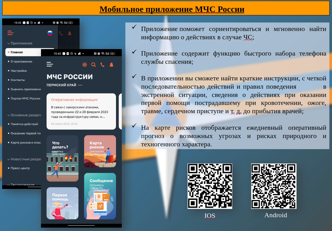МЧС России разработало мобильное приложение, которое позволяет подготовиться к различным чрезвычайным ситуациям, получать актуальную информацию о возможных угрозах и рисках.